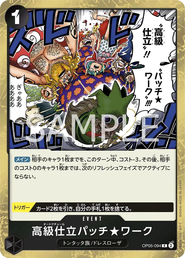 サーチカードとして採用候補に挙げられます。「④ベンサム」「④ベーブ」「⑦オールサンデー」といった、トラッシュからキャラを回収・登場させる重要カードや、デッキのフィニッシャーである「⑧クロコダイル」を安定して手札に加えるためのサーチ枠として採用しています。デッキの回転力を高めつつ、後半の展開を支えるカードとして機能します。