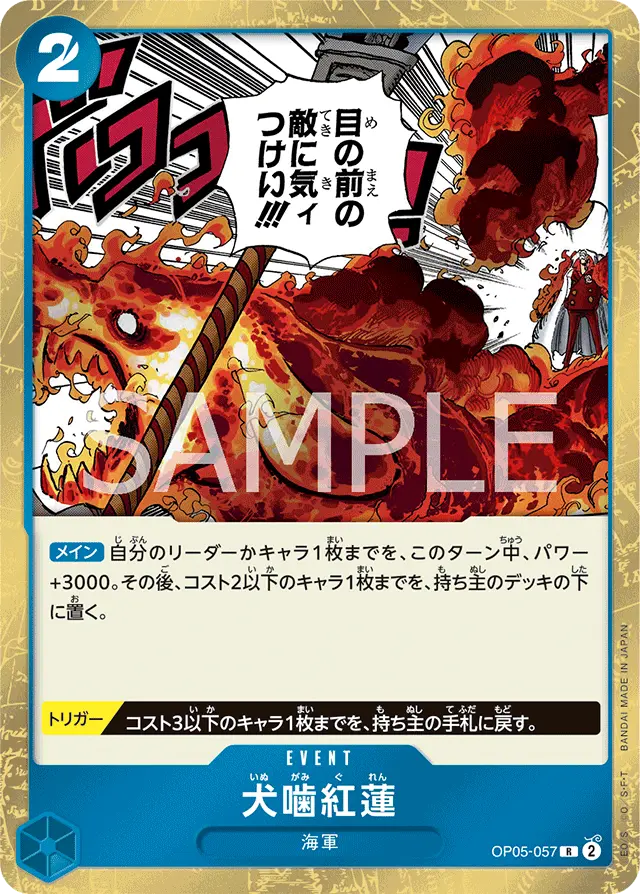 バウンス効果を持つだけでなく、リーダー「サカズキ」の手札整理効果でカードを捨てることで速攻アタッカーとして機能するため、フィニッシュ性能の高いカードとなっています。