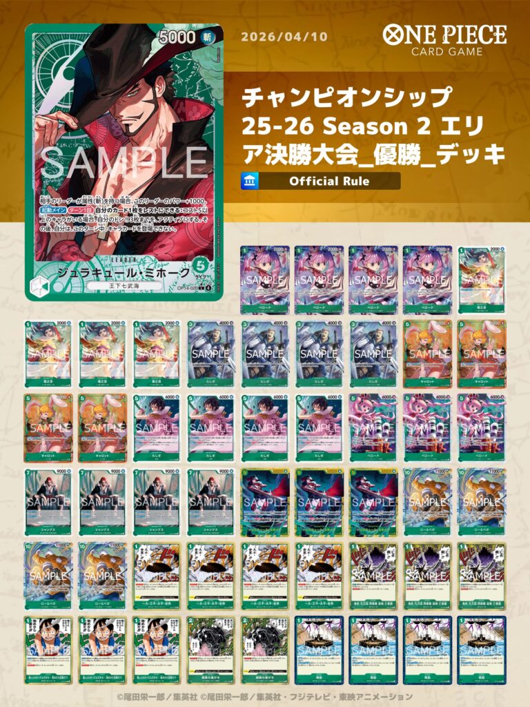 本デッキは相手をレストにして相手のゲームプランを崩しつつ進めるコントロール型の構成です。序盤はイベントカードを盤面に出すことで有利に展開でき、リーダー効果もデメリットなく運用できます。序盤から中盤にかけては「⑤たしぎ」「⑦シャンクス」をアタッカーとして運用し、「⑤ペローナ」でサポートすることで相手の計画を崩しながらゲームを進めます。終盤では「⑨ミホーク」「⑩ロー&べポ」を活用してアタックと相手のアタック・ブロックを制限し、リーサルを狙います。「棺船」によって自分のターン終了時にアクティブのドンを作り出せますが、イベントカードによる防御札はリーダーのみが使用可能なため、キャラを守る目的でカウンター+2000のキャラを多く採用しています。
