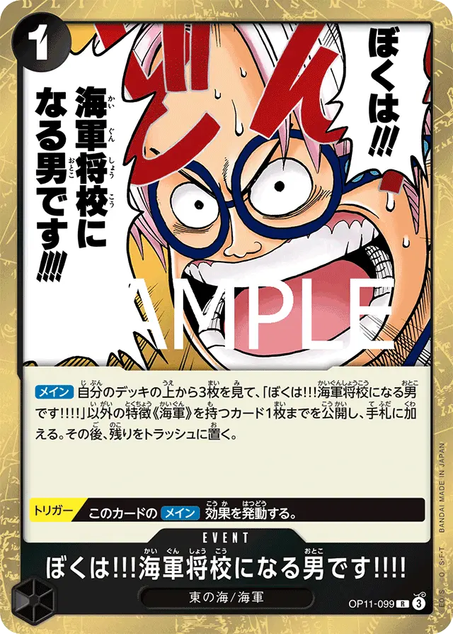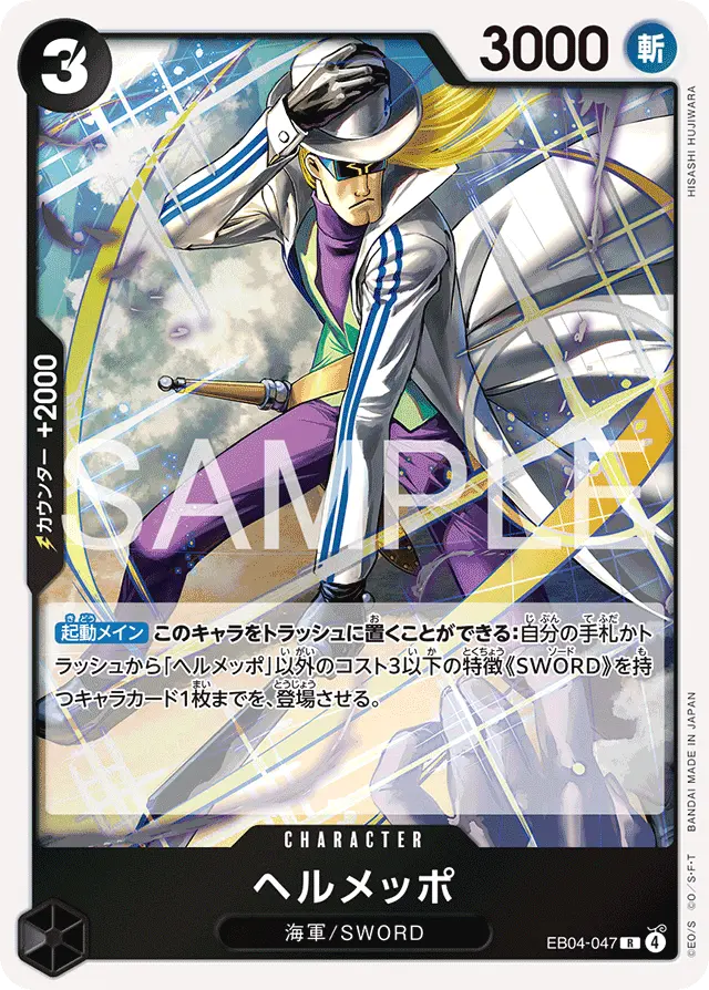 キーカードである「⑥ヘルメッポ」「⑥コビー」を手札に加えることを主な目的としつつ、トラッシュにカードを蓄積することでリーダー「コビー」の除去耐性効果を発動しやすくする役割も担うため採用しています。