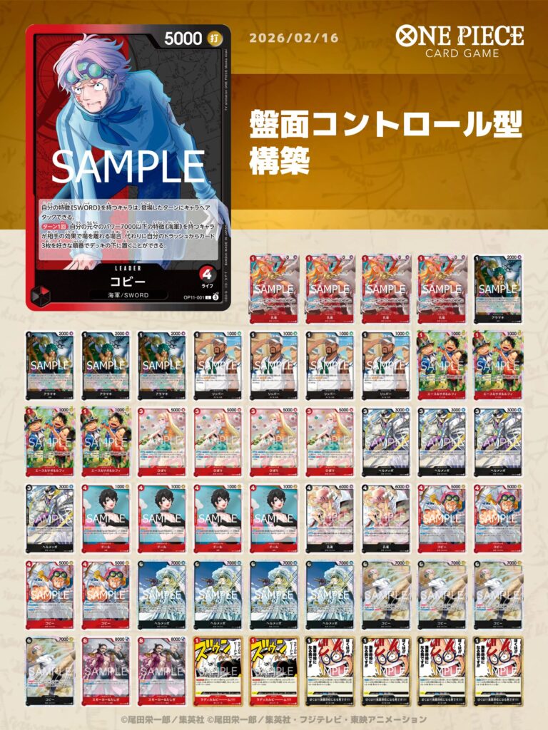 本デッキはリーダー「コビー」の効果により、除去耐性と除去性能の両方を兼ね備えている点が特徴で、盤面を有利にコントロールしながらゲームを進めることができます。