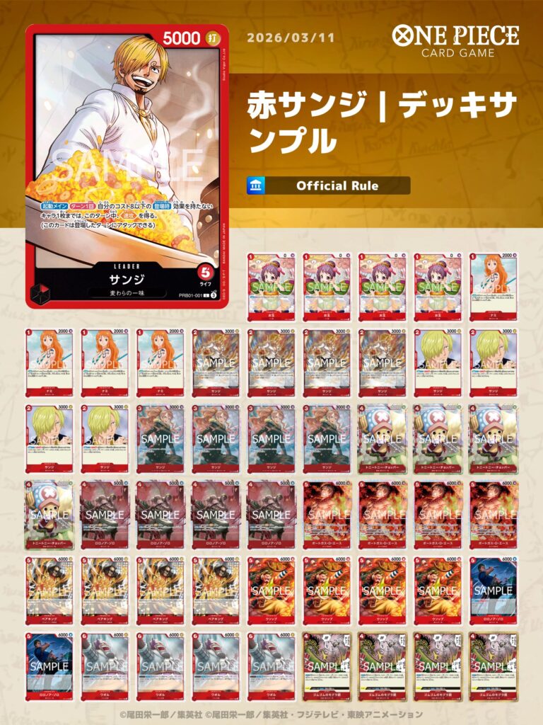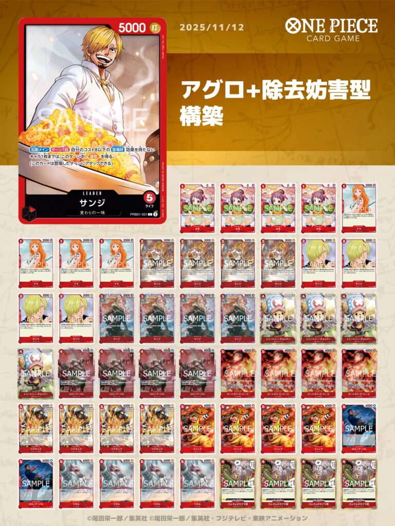 赤サンジデッキは、複数回のアタックを軸とした構成のため、盤面のキャラを簡単に除去されないことが非常に重要です。そのため、除去されにくいキャラを中心にデッキを構築しています。